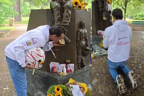 அவரது சிலையின் ஷூவுக்கு முத்தம் கொடுத்து, முன்பு மண்டியிட்டு அவர் வணங்கி இருக்கிறார்.