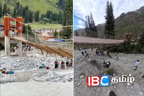கேபிள் உடைந்த பிறகு பாலம் ஒரு பக்கமாக சாய்ந்தது, மேலும் சுற்றுலாப் பயணிகள் குழு அதில் தொங்குவதைfாணொளியில் படம் பிடித்தனர்.