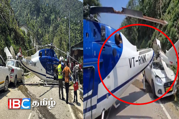 தரையிறக்க முற்பட்டபோது, உலங்கு வானூர்தியின் வால் பகுதி மோதியதில் சாலையில் இருந்த கார் சேதமானது.