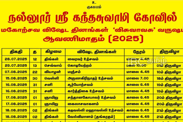வரலாற்றுச் சிறப்புமிக்க நல்லூர் கந்தசுவாமி (Nallur Kandaswamy kovil) ஆலய வருடாந்த மகோற்சவம் நாளையதினம் (29.07.2025) செவ்வாய்க்கிழமை காலை 10 மணிக்குக் கொடியேற்றத்துடன் ஆரம்பமாகவுள்ளது.