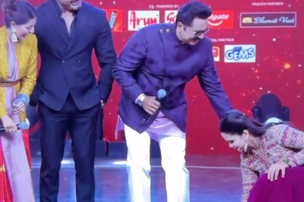 மேடையில் சரத்குமார் தனது சூர்யவம்சம் படம் பற்றி பேசி இருக்கிறார். அப்போது மணிமேகலை தனது மோதிரத்தை கீழே போட்டுவிட்டு அதை எடுப்பது போல சரத்குமார் காலில் விழுந்து இருக்கிறார்.