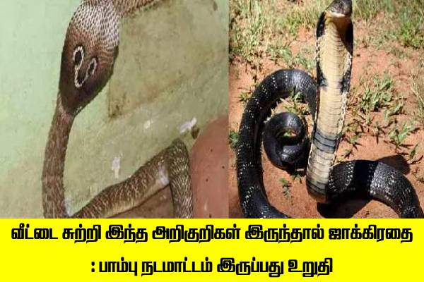 மேற்கண்ட அறிகுறிகளை வைத்து உங்கள் வீட்டுக்குள்ளோ அல்லது வீட்டைச் சுற்றியுள்ள பகுதிகளிலோ பாம்புகள் நடமாட்டம் இருப்பதைக் கண்டறிய முடியும்.